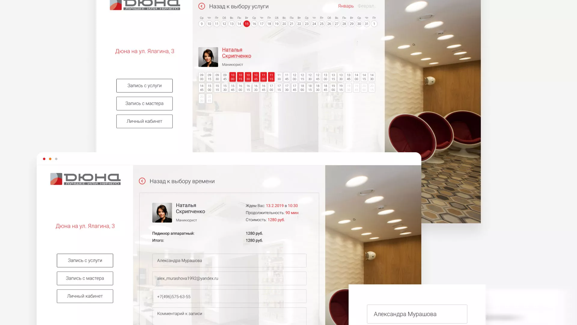 В разделе «Личный кабинет» содержатся все текущие записи в салоны красоты в Свободном, с возможностью их отмены. Также, здесь можно редактировать свои персональные данные, ознакомиться с историей записей и видеть бонусы и акции салонов красоты.